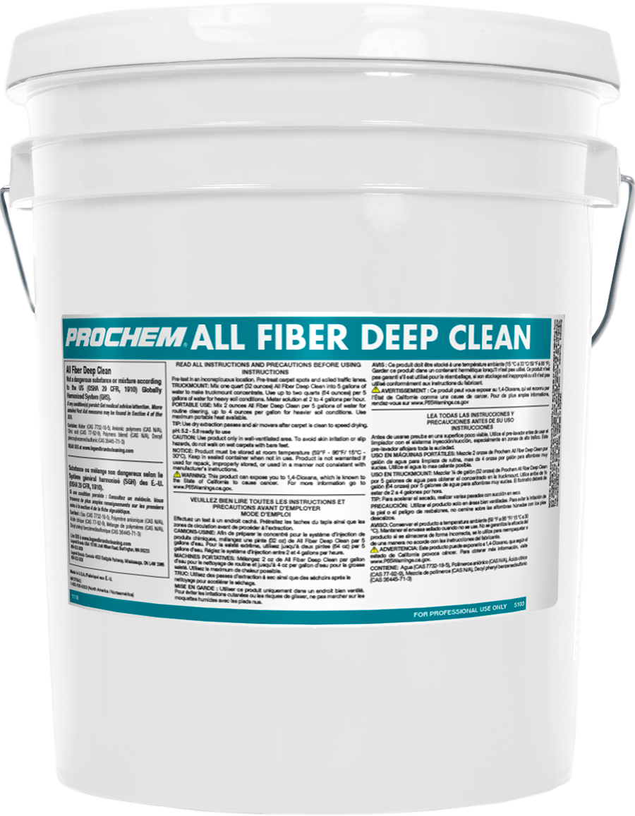 Prochem's All Fiber Deep Clean Rinse is an acidic extraction rinse powerful enough to be used for residential and commercial carpet cleaning and on many upholstery fabrics. Excellent for use on both synthetic and wool fibers. New-generation polymer technology encapsulates and crystallizes soils and prespray residues for maximum soil removal with minimal residues.