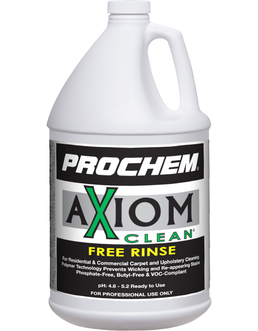 Axiom Clean Free Rinse is an acidic liquid extraction agent for truckmounts or portables. It will leave fibers soft and vibrant. This new generation polymer technology encapsulates soils and flushes out prespray for maximum soil removal with minimal residues.