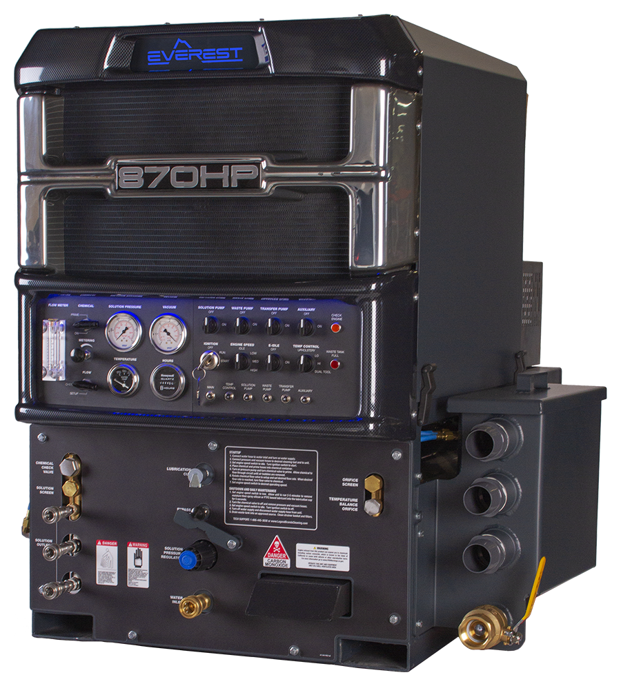 The Everest 870 HP is our most powerful cleaning and extraction truckmount - and 50-state CARB-compliant. It pairs a liquid-cooled fuel-injected Kubota 4-cylinder engine with a Eurus vacuum blower to deliver industry-leading heat, extraction performance and durability. Plus, 4-setting thermologic control regulates solution temps and adjusts engine speed for maximum fuel and cleaning efficiency.