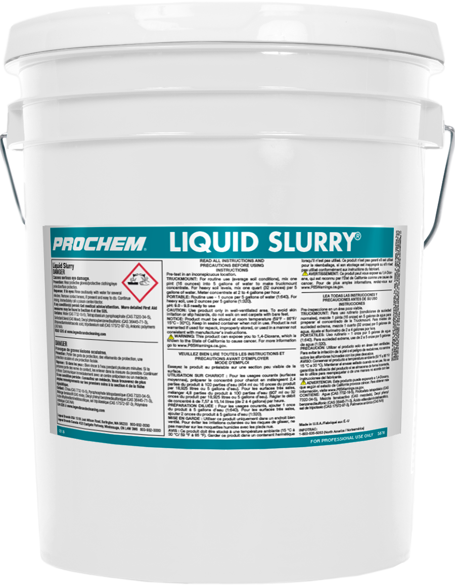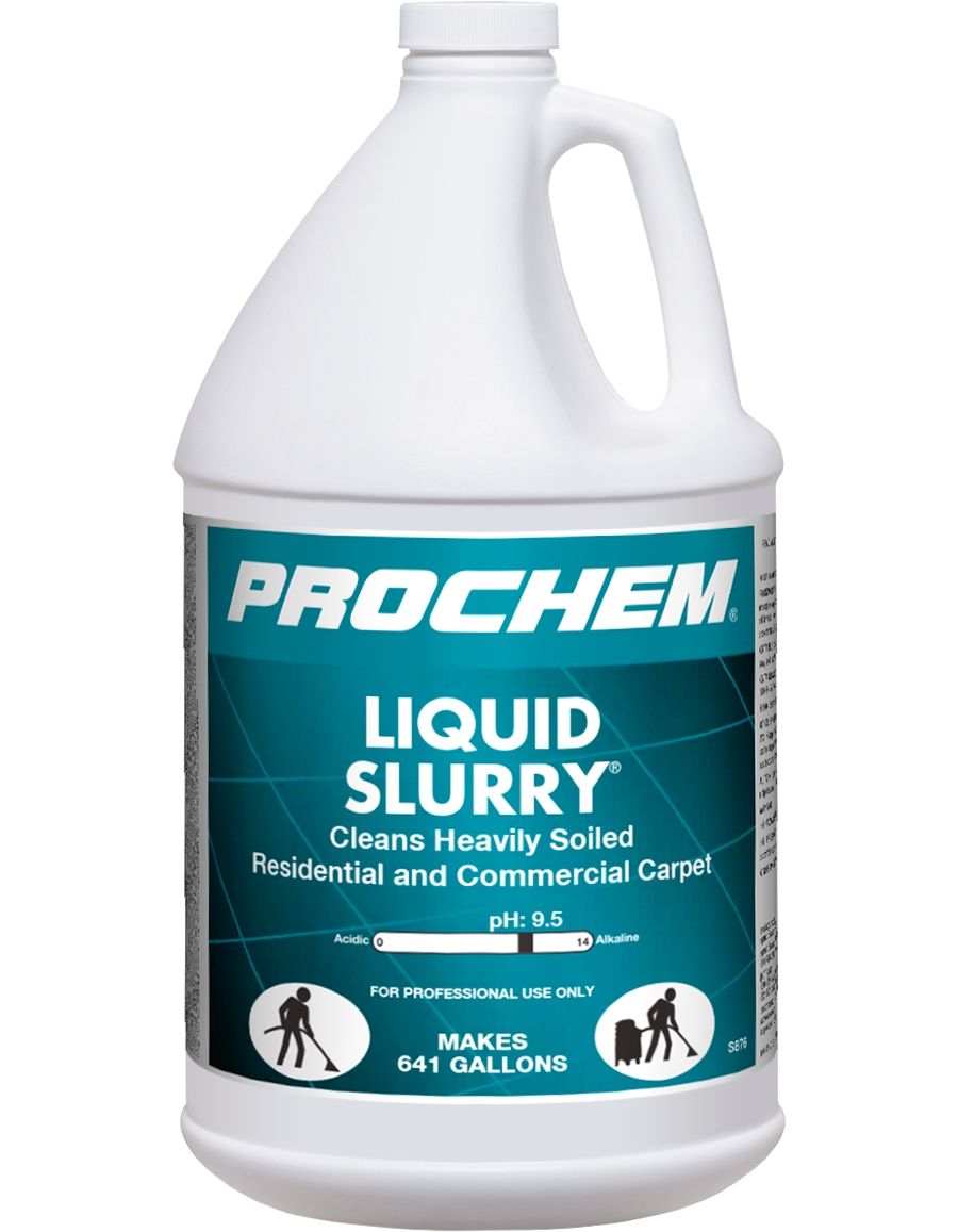 Our Liquid Slurry is a extremely potent solution that uses the strength of alkaline builders and powerful surfactants to quickly emulsify suspended greasy soils, grime and prespray residues leaving fibers bright, soft and clean! Safe for use on fifth generation nylon carpets. Now formulated with new-technology polymers that surround remaining microscopic soils that can lead to wicking and browning, Liquid Slurry captures soils during the drying process for easy removal and a superior long-lasting clean! Ideal for truckmount use and portables, dissolves quickly and contains corrosion inhibitors to protect your equipment.